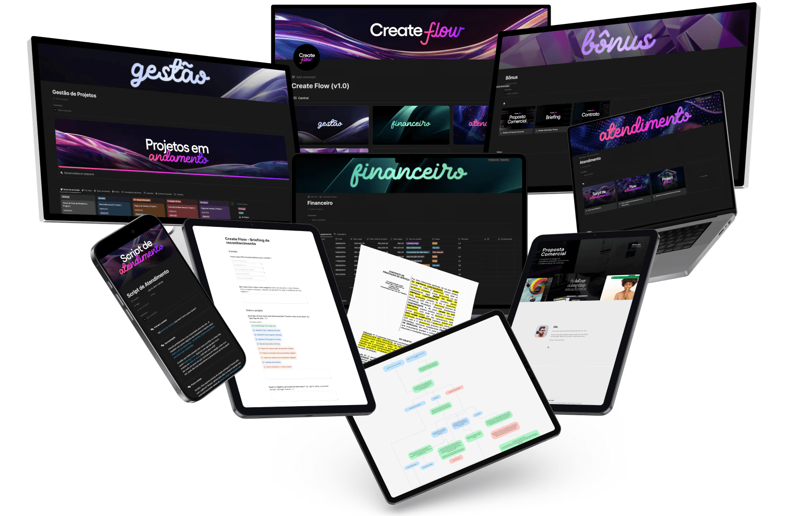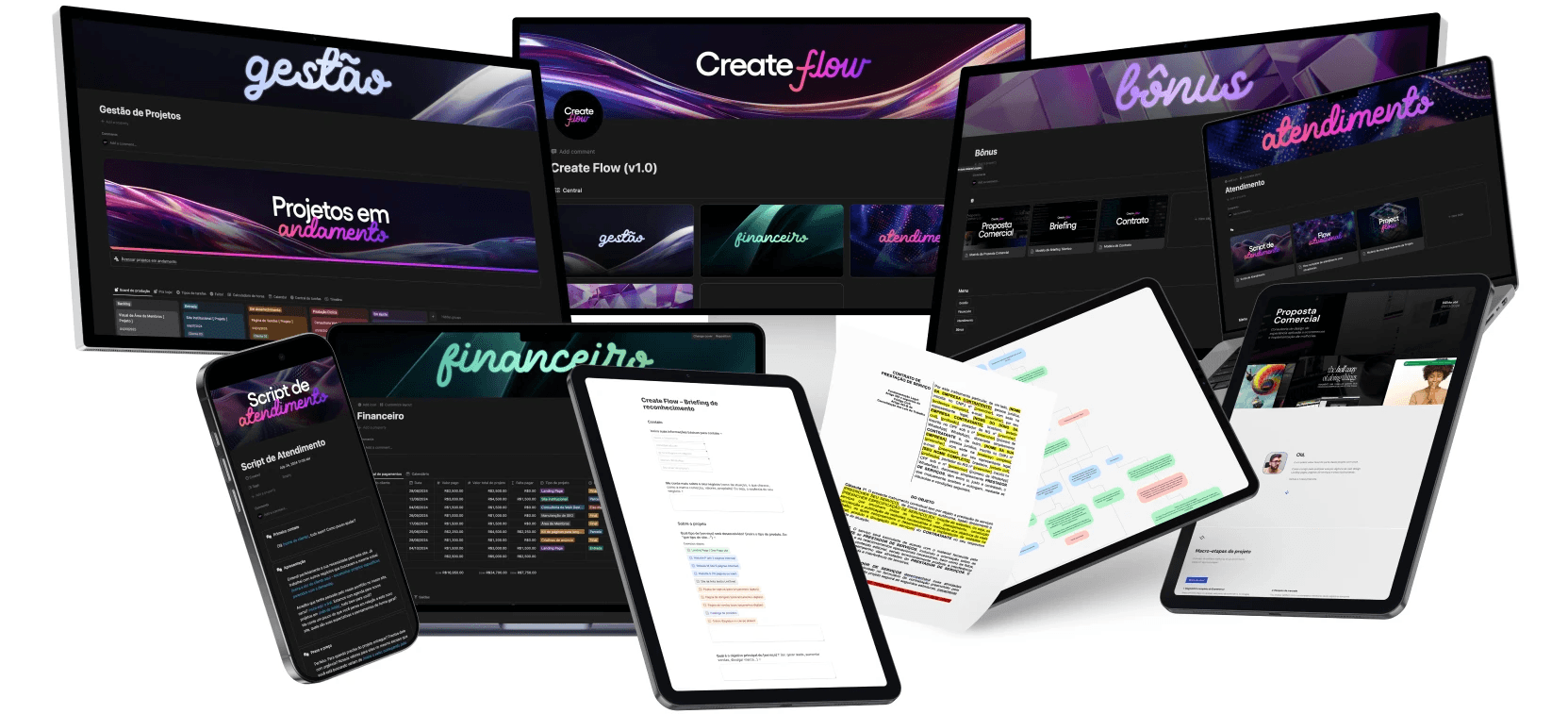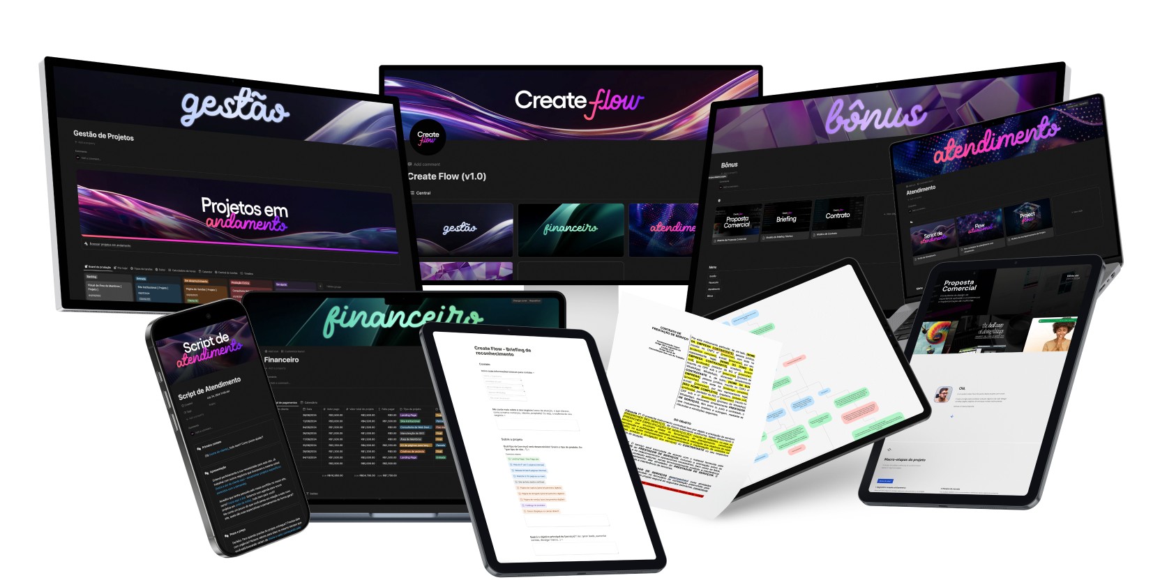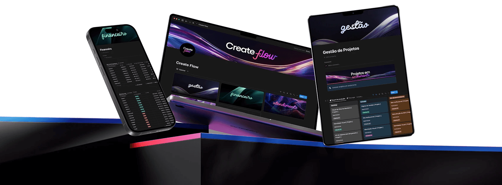 Com o Create Flow, você elimina o retrabalho, controla cada centavo que entra e sai e transforma produtividade em lucro — tudo 100% integrado no Notion, pronto para usar.